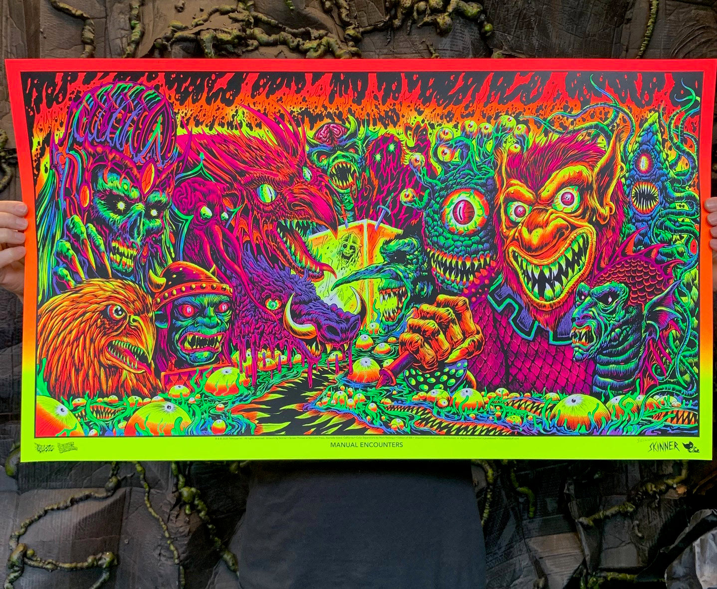21x36 inch mega print! Screen printed black lite monster blast! Signed by me and ready to please your creature addiction for years to come! Printed by the great Monolith Press! $75 all the creatures from the old manual that you love!